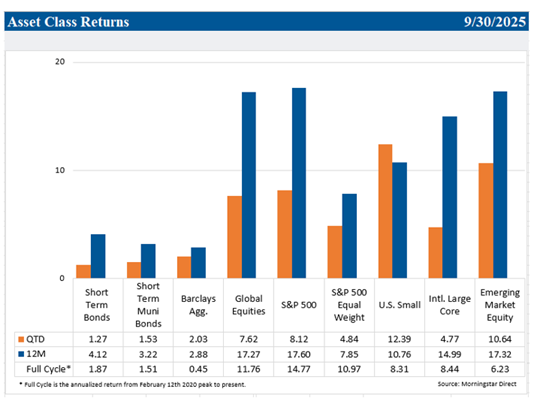 All major fixed income categories delivered positive returns. Yields declined across the curve especially for shorter maturities as investors anticipated the resumption of Fed easing. Multi-sector fund returns were fueled by continued spread tightening. In fact, credit spreads for both investment grade and high-yield bonds ended the quarter at or near their tightest levels ever. Municipal bonds were the best performing sector as investors took advantage of historically attractive muni-to-treasury yield ratios.