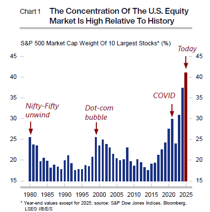 However, today’s market is not only highly concentrated in terms of market value, but it has also become increasingly and highly leveraged to a single theme. Of course, we are referring to the boom in artificial intelligence. The hyperscale cloud providers (Microsoft, Meta, Alphabet, and Amazon) make up about 20% of the index. Two semiconductor companies, NVIDIA and Broadcom, comprise another 10%. Collectively, these six stocks have a market value of more than 50% of U.S. GDP. It is estimated the hyperscale cloud providers account for 30% of all capital expenditures made by companies in the S&P 500.