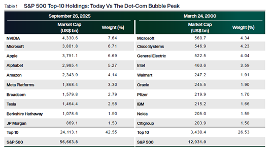 However, investor and corporate behavior is becoming more reminiscent. The A.I. capex spending binge is beginning to resemble the telecom buildout of the internet era. A series of large related and interconnected transactions has created a circular ecosystem that is heavily concentrated in just a handful of companies. “Nvidia plans to invest in OpenAI, which is buying cloud computing from Oracle, which is buying chips from Nvidia, which has a stake in CoreWeave, which is providing artificial intelligence infrastructure to Open A.I.1 Nvidia is receiving equity in OpenAI in return for delivering chips while Advanced Micro Devices is giving away equity to OpenAI in exchange for revenue. Several of these transactions are reminiscent of vendor financing in the late 1990s in which telecom equipment makers loaned large sums of money to both new and established carriers to enable them to purchase equipment.