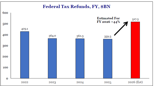 Several OBBBA provisions (e.g. 100% expensing for capex, domestic R&D, and the building of production facilities) are retroactive to 1/1/2025 and are affecting companies’ bottom lines now. September 2025 corporate tax payments are estimated to be 40% lower than the amount in September 2024 (and mostly offset by tariff revenues). Moreover, 328 companies mentioned the positive effects of OBBBA during the second quarter earnings reporting season with business tax cuts as the most cited benefit. The Act’s stimulus for the consumer is significant but won’t be felt until early 2026. Consumers are expected to receive an additional $150bn in refunds during the 2026 tax season.